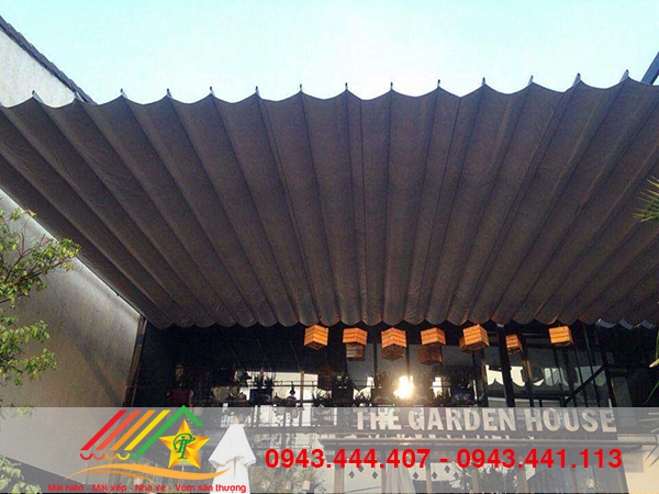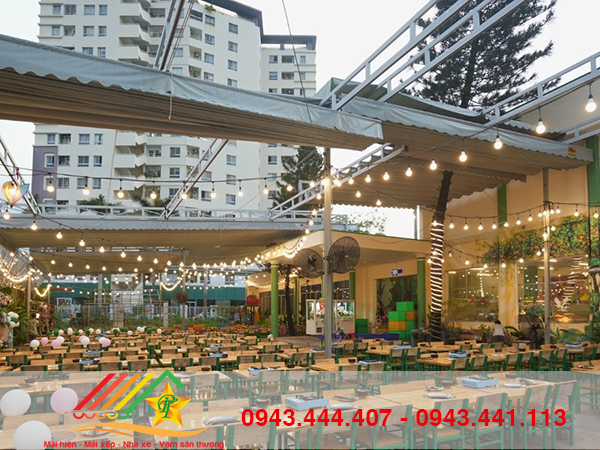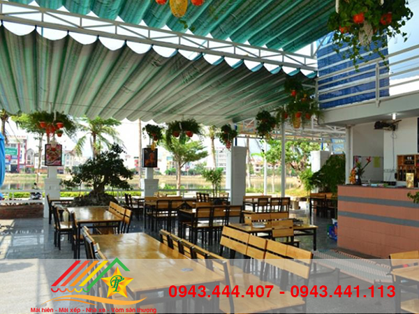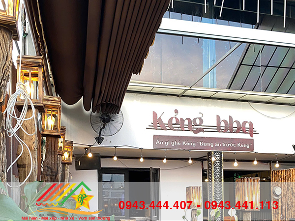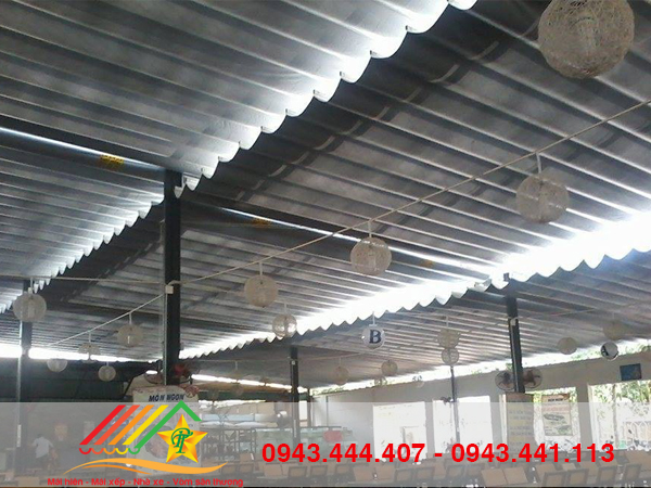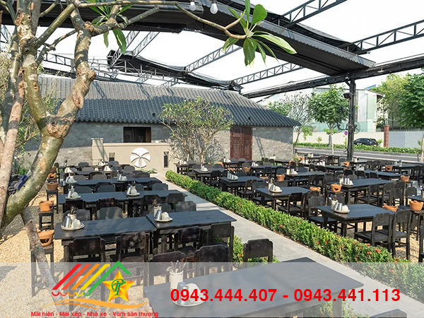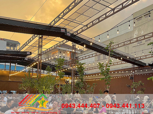 - Mái xếp lượn sóng (Mái bạt kéo): Giải pháp phổ biến nhất cho các quán nhậu, lẩu nướng, quán BBQ. Khung thép bền vững kết hợp với bạt che di động, có thể điều chỉnh theo thời tiết.
